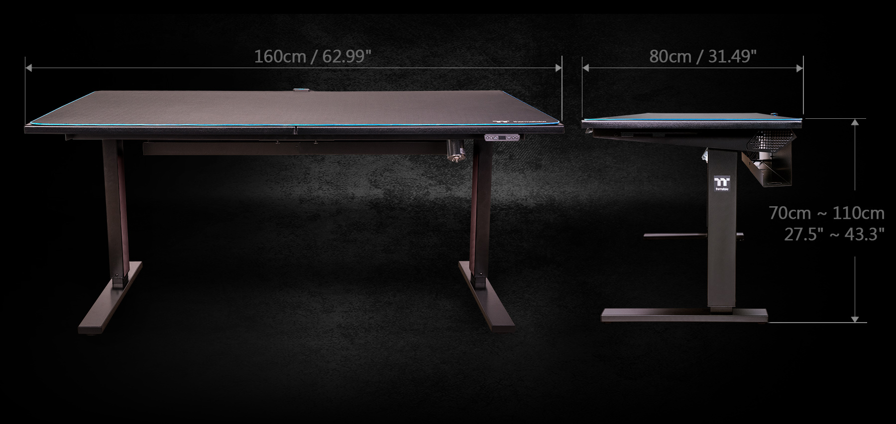 | spec_Desktop | Size : 160cm(L) x 80cm(W) / 62.99"(L) x 31.49"(W) Desktop thickness : 2.5cm / 0.98" Max desktop support : Up to super tower chassis (dimensions: 27.2" x 13.5" x 25.4") Material : MDF desktop - premium material with anti-scratch / high-pressure Laminate P2 Scratch coating : Yes Table feet material : Iron |