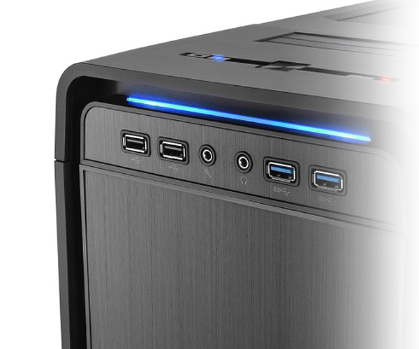 The front-top panel has implemented two of latest data transfer SuperSpeed USB 3.0 ports along with two USB 2.0 ports, a HD microphone and headset jacks, to grand direct access when needed.